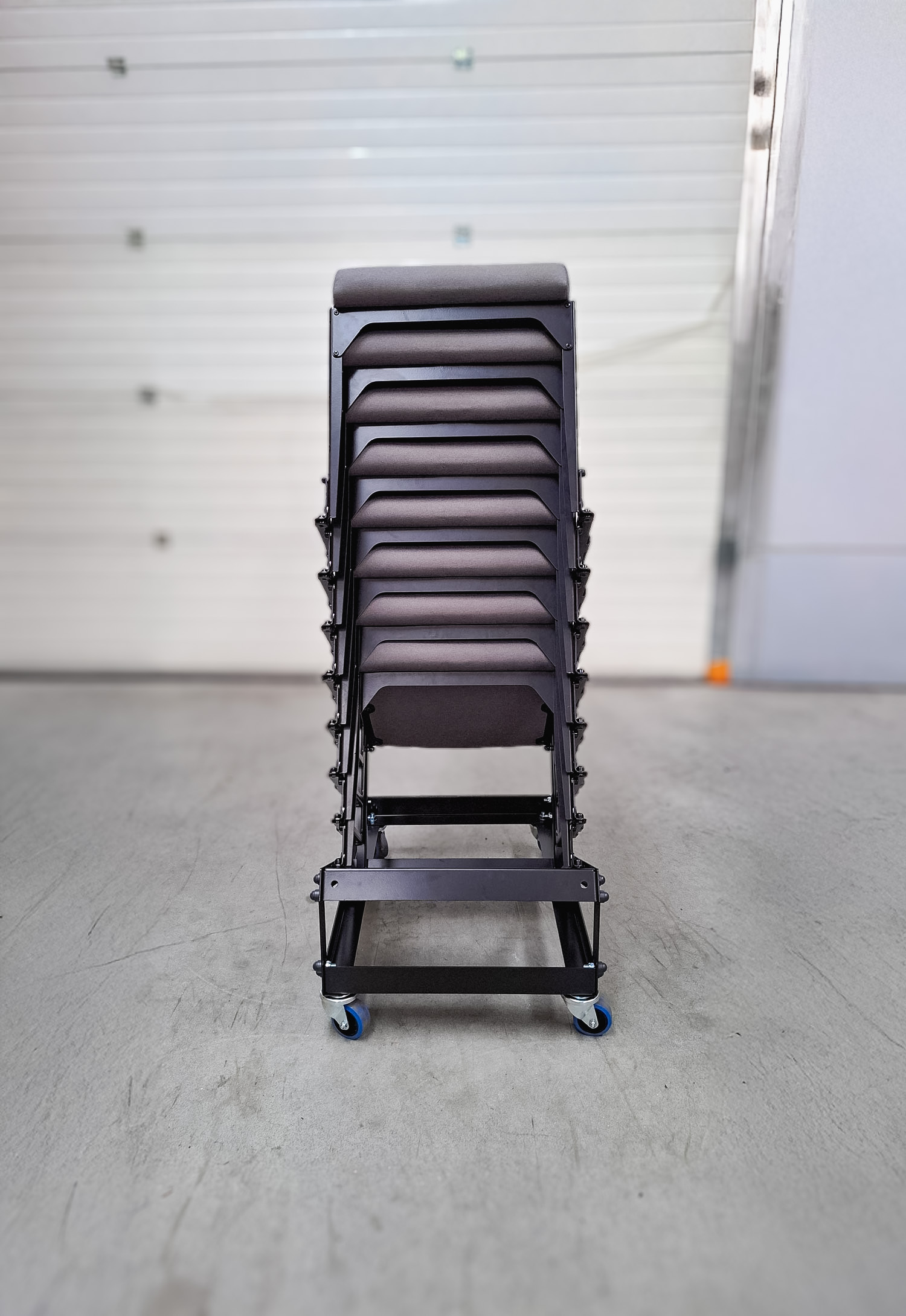 When it’s time to clear the space, storage is just as efficient. Each chair stacks easily onto our custom-designed trolleys, up to ten per unit, and can be moved with a simple push-pull motion to its designated storage area.